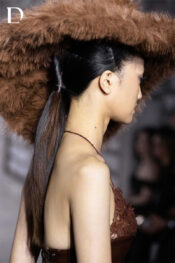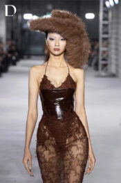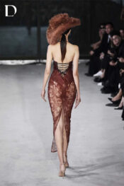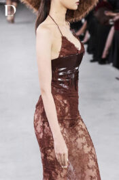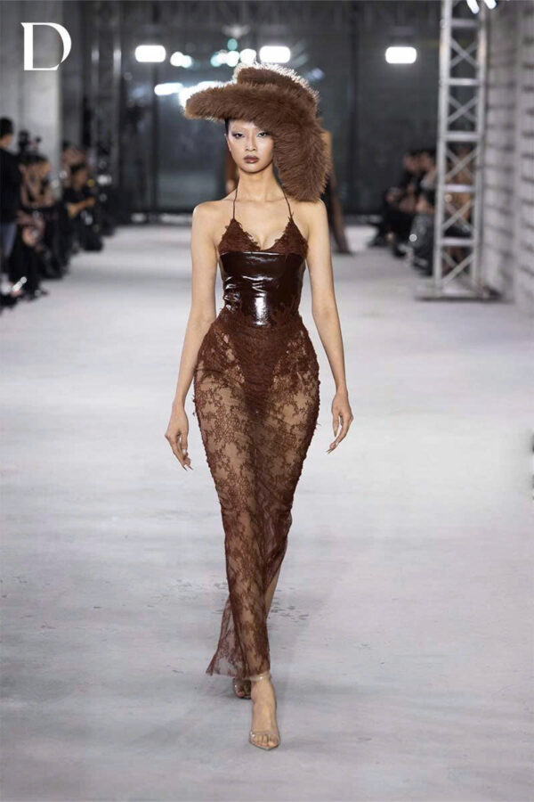 Thiết kế gam burgundy brown. Trang phục kết hợp da simili và ren, tạo tương phản giữa cấu trúc và bề mặt. Phần váy ren xuyên thấu kết hợp cùng corset da đính kết ren cắt tỉa, hoàn thiện silhouette với độ sắc nét và chiều sâu.