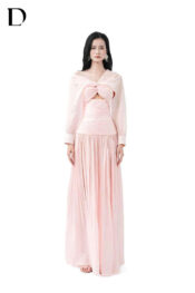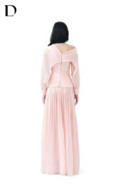 Thiết kế maxi dress trên nền chiffon, gam màu pink. Vải tơ dập ly kết hợp draping, xẻ chân.