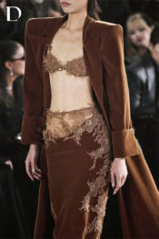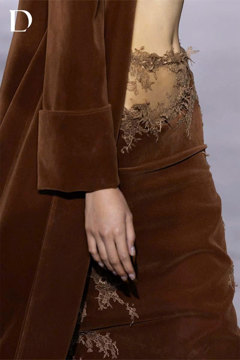 Thiết kế tông nhung gam brunette brown với phom vai vuông. Bên trong là áo top đính kết tạo điểm nhìn và khoảng hở. Váy nhung dựng phom ở hông, kết hợp mảng ren đính kết chạy dọc thân váy, hoàn thiện tổng thể theo tinh thần EMERGE.