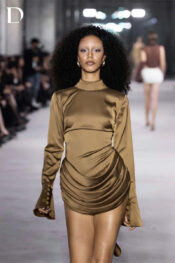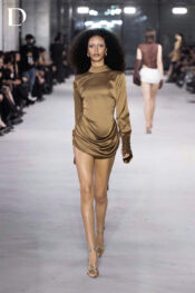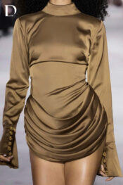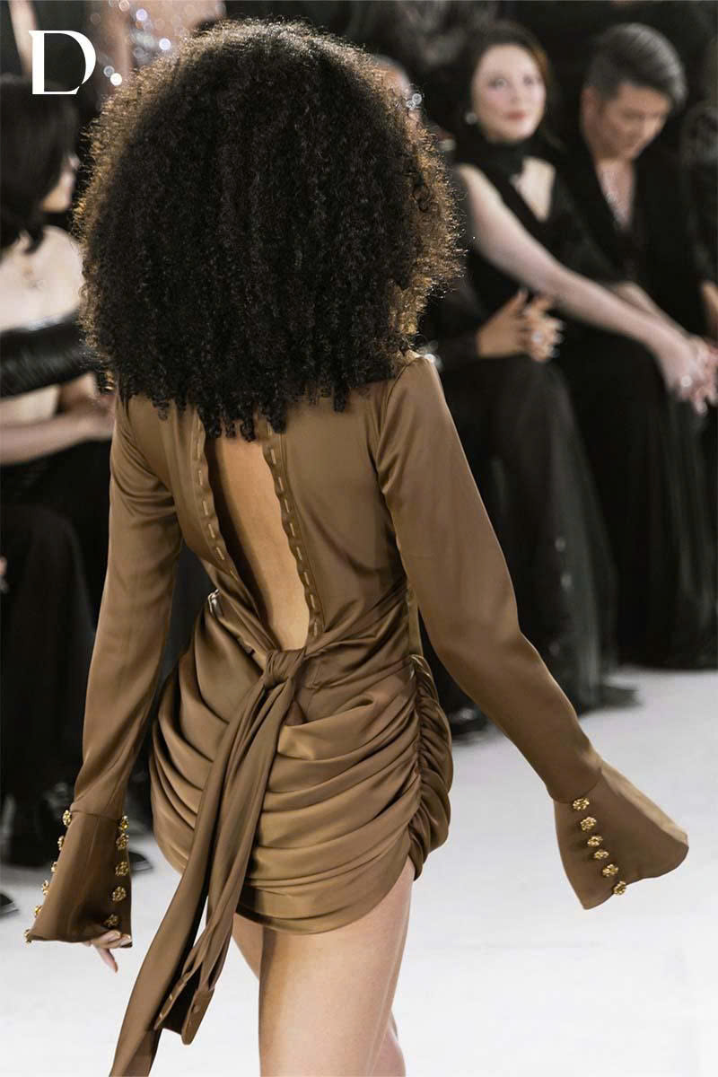 Thiết kế sử dụng chất liệu lụa, giữ độ rũ và phom gọn. Phần áo xử lý theo form sơ mi ngược hở lưng. Kết hợp cùng chân váy bắt xếp, tạo cân bằng giữa chuyển động và cấu trúc.