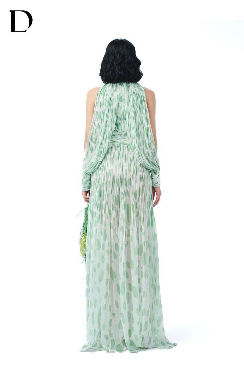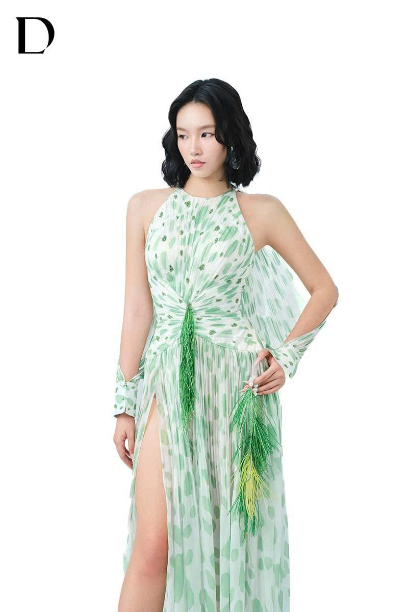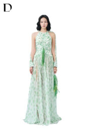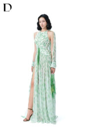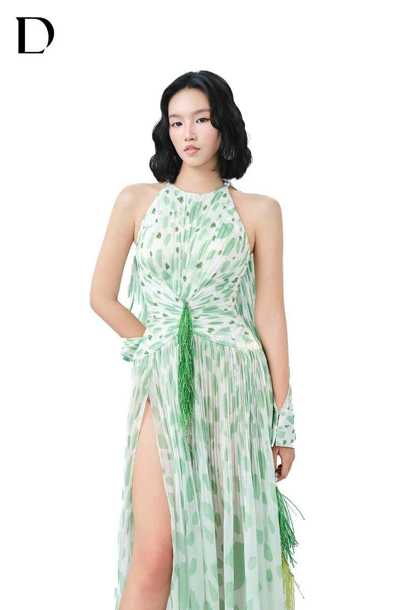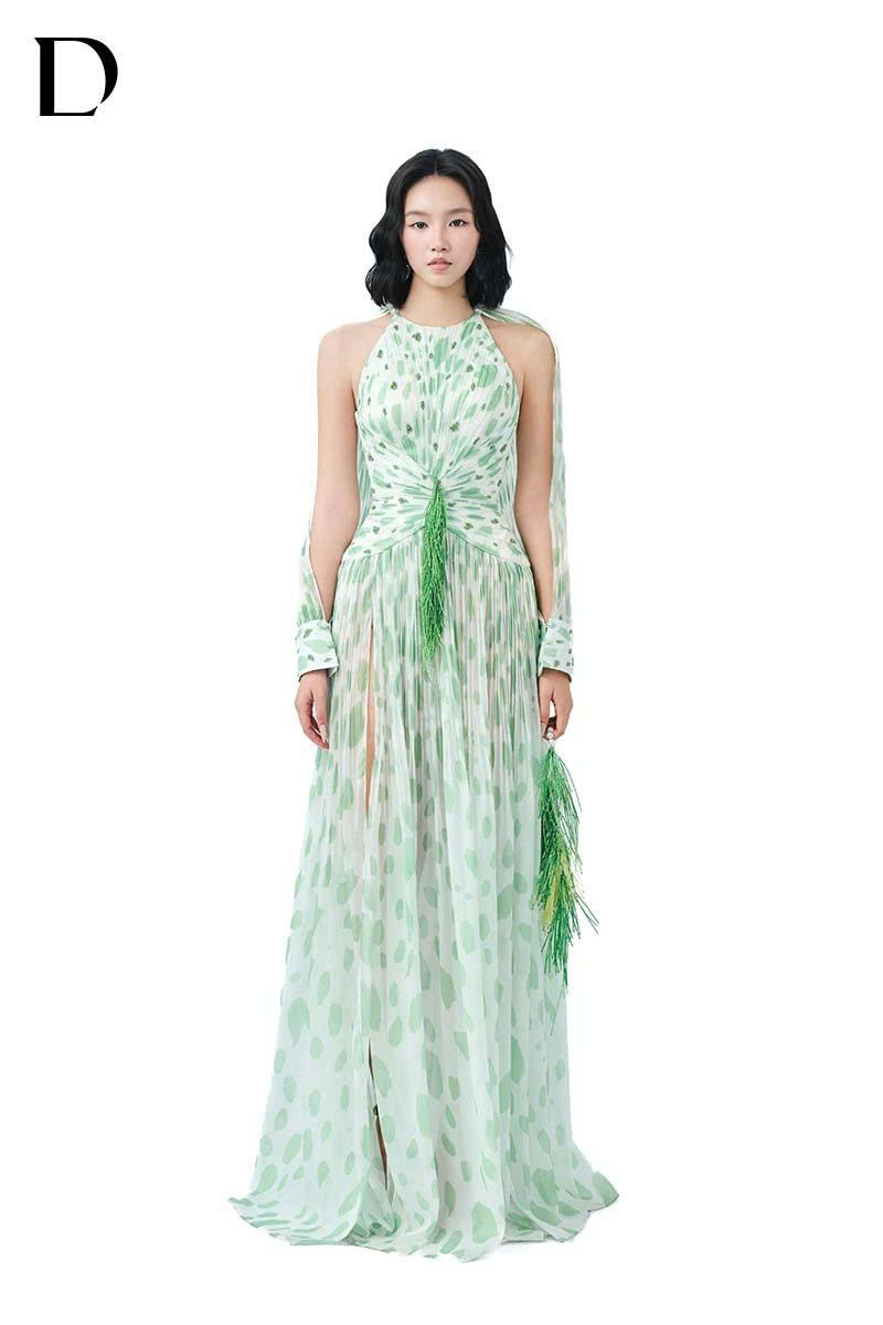 Thiết kế maxi dress trên nền chiffon, gam màu light green. Cấu trúc layer xuyên thấu, tay dài xẻ cao, phát triển hoạ tiết báo đốm cách điệu, kết hợp đính kết.