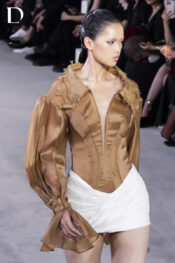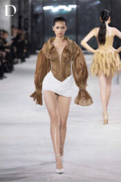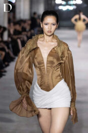 Thiết kế kết hợp tơ và tafta kim tuyến, tạo bề mặt ánh nhẹ và giữ phom. Phần áo xử lý theo dáng sơ mi corset thắt eo, tay phồng lớn và cut-out giữa ngực. Chân váy độn hông bắt xếp chéo, tạo phom dáng rõ nét và chuyển động.