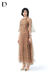 Thiết kế midi dress trên nền lưới, gam màu nude/be. Lưới in hoạ tiết, xử lý xếp ly rút nhún, kết hợp đính kết nhẹ.