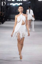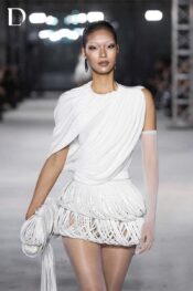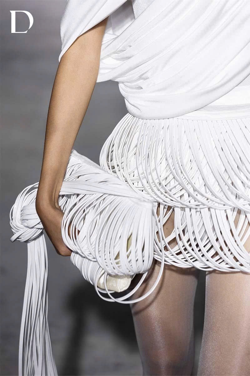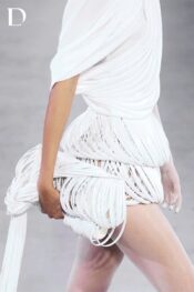 Thiết kế đầm mini lệch vai trên nền thun cao cấp kết hợp dây da simili. Phần thân trên draping thủ công, chân váy xử lý xếp nếp, tạo cấu trúc 3D và chuyển động.