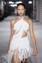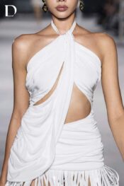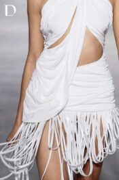 Thiết kế màu trắng trên nền thun kết hợp dây da. Phom đầm ngắn hở vai với draping và bắt xếp tinh gọn. Chi tiết dây tua rua bố trí dọc các mảng draping, tạo nhịp điệu và chuyển động cho tổng thể.