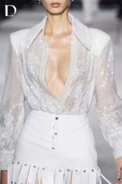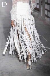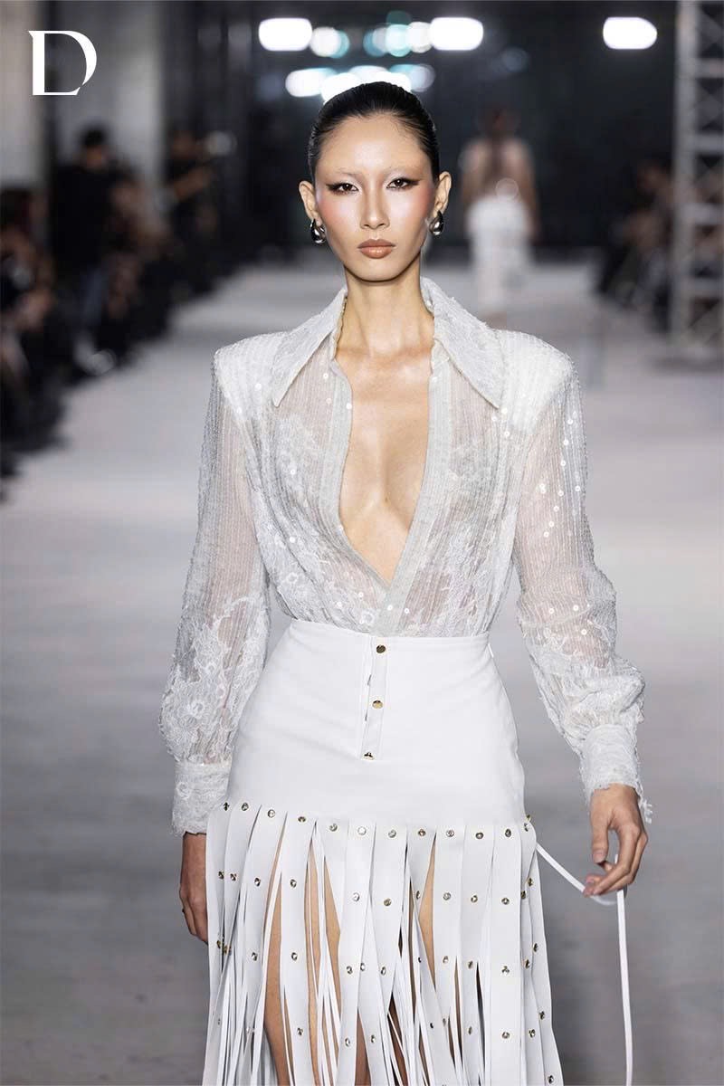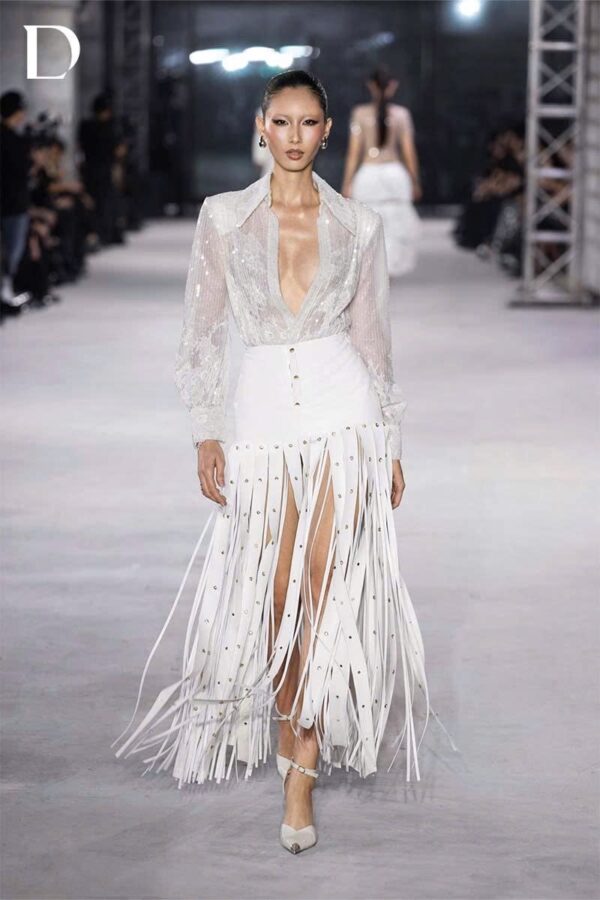 Áo sơ mi kim sa xuyên thấu xử lý cùng các mảng ren cắt tỉa thủ công. Kết hợp chân váy tua rua da từ nhiều dây simili, hoàn thiện bằng khoen kim loại pha lê, tạo chuyển động và hiệu ứng bắt sáng.