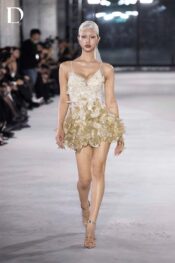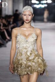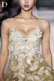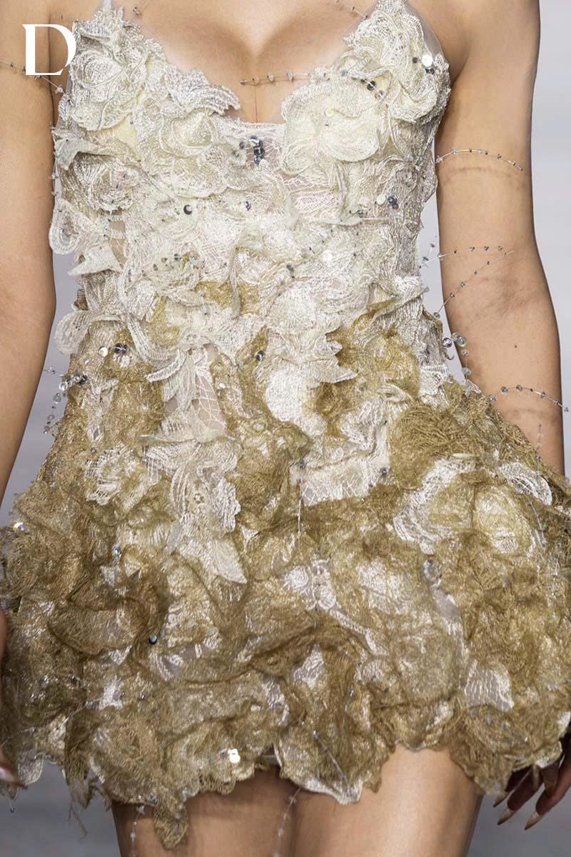 Thiết kế gam white beige trên nền ren và lưới. Váy ngắn hai dây xử lý ren cắt tỉa thủ công. Hiệu ứng ombré ren đính kết chạy dọc thân váy, kết hợp tua rua thủ công tạo chuyển động và hiệu ứng bắt sáng.