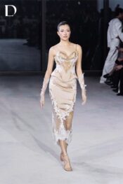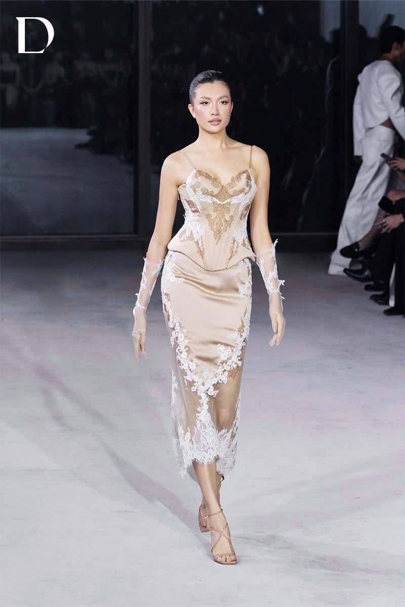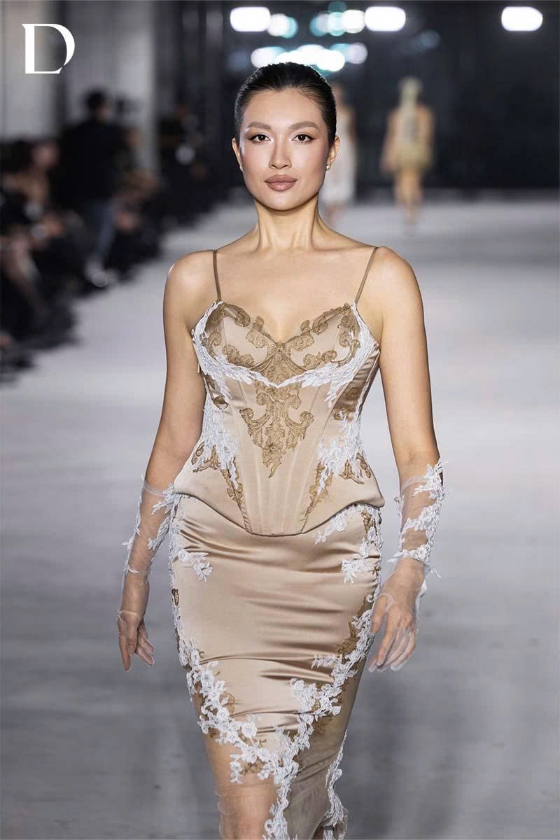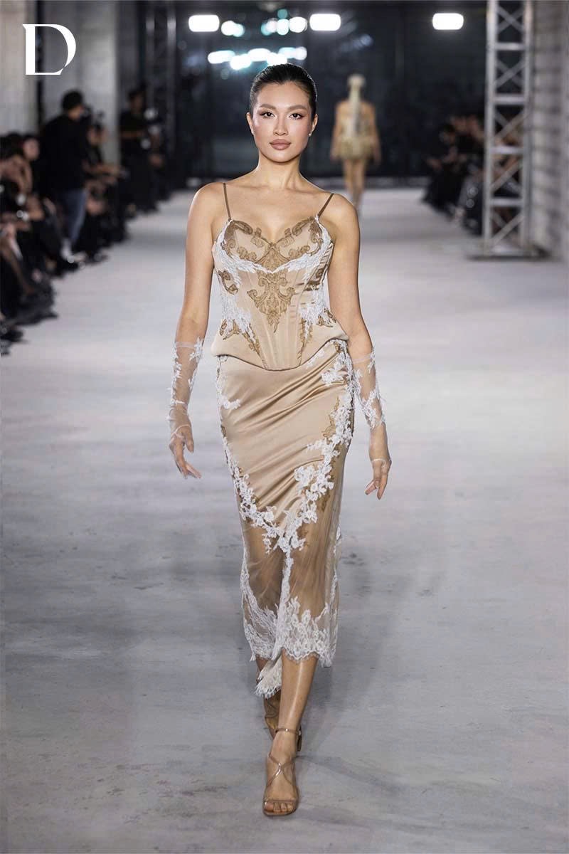Thiết kế gam beige kết hợp lụa và ren. Corset lụa dựng phom gọn, định hình thân trên. Váy lụa đuôi cá với cut-out tinh gọn, bề mặt đính kết ren thủ công, tạo độ bắt sáng và chi tiết.