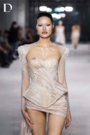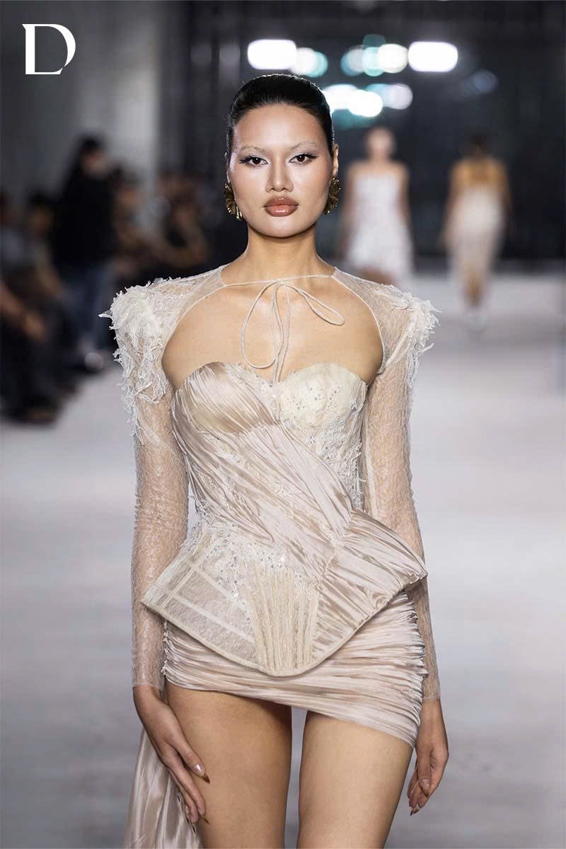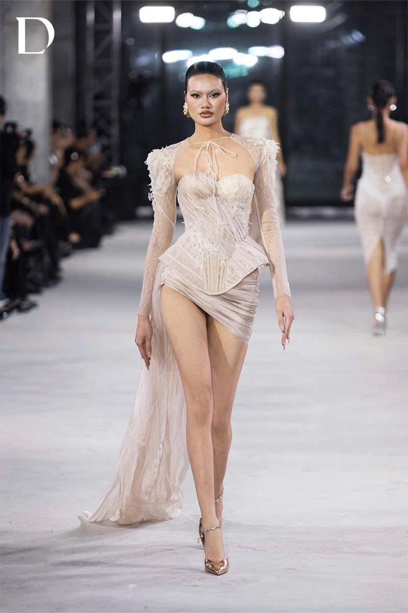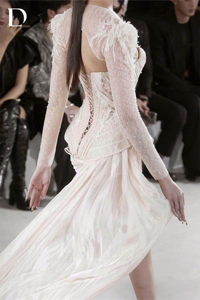 Thiết kế kết hợp ren và voan tơ. Váy corset xuyên thấu dựng 3D ở hông, định hình silhouette. Chân váy voan tơ bắt xếp chéo với tà bay tạo chuyển động. Áo khoác ren đồng chất liệu hoàn thiện lớp layering.