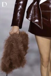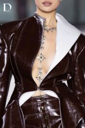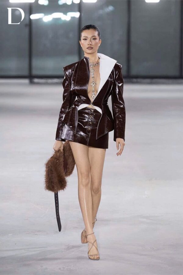 Trang phục kết hợp chất liệu da simili, lưới và tafeta tạo độ tương phản rõ nét. Blazer da bóng được xử lý cổ V cao bất đối xứng giúp phom dáng trở nên dứt khoát và thu hút. Chân váy mini được dằn chỉ tạo cấu trúc mạnh, trong khi bodysuit bên trong đính kết đá mang lại hiệu ứng lấp lánh tinh tế dưới ánh đèn runway.
