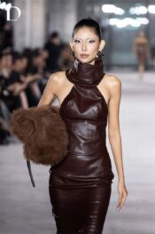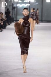 Thiết kế màu burgundy mang sắc thái trầm quyền lực, sử dụng chất liệu da cotton, tạo phom dáng chắc và hiện đại. Set áo váy được xử lý theo cấu trúc cổ yếm với phần cổ xếp cao, tôn đường vai và tạo hiệu ứng thị giác mạnh.