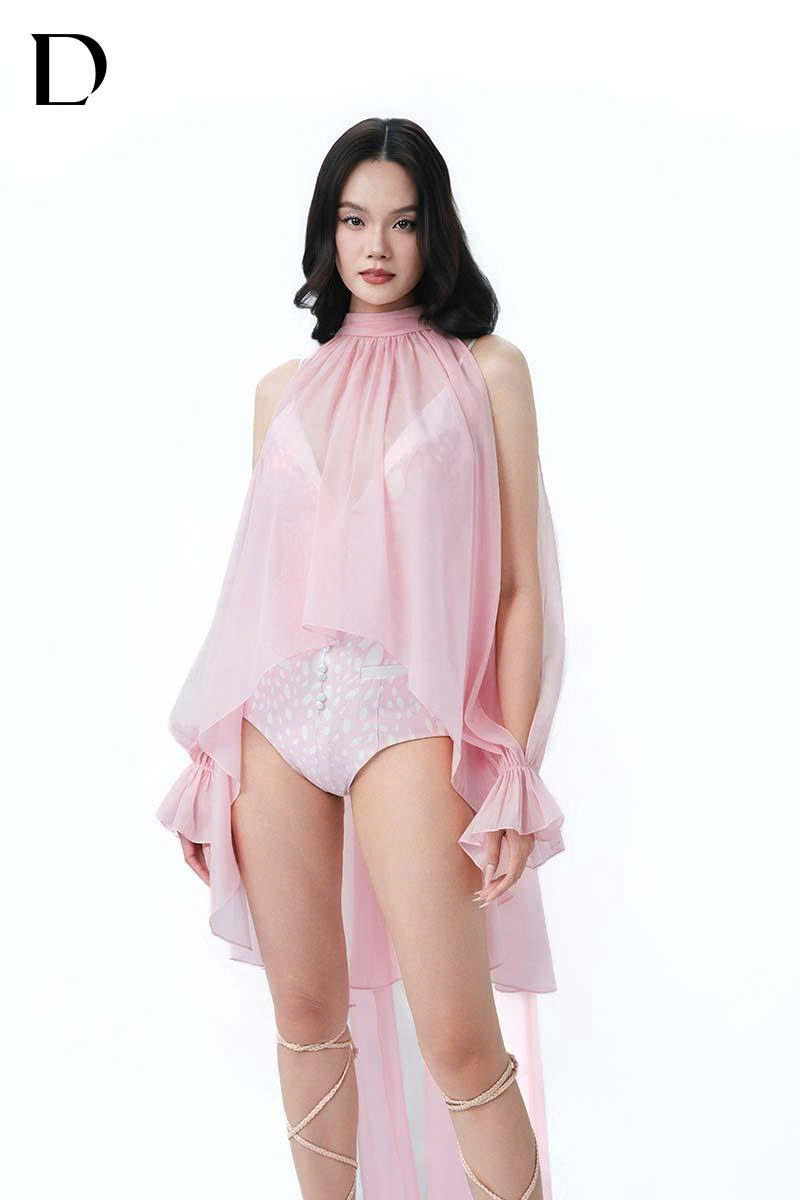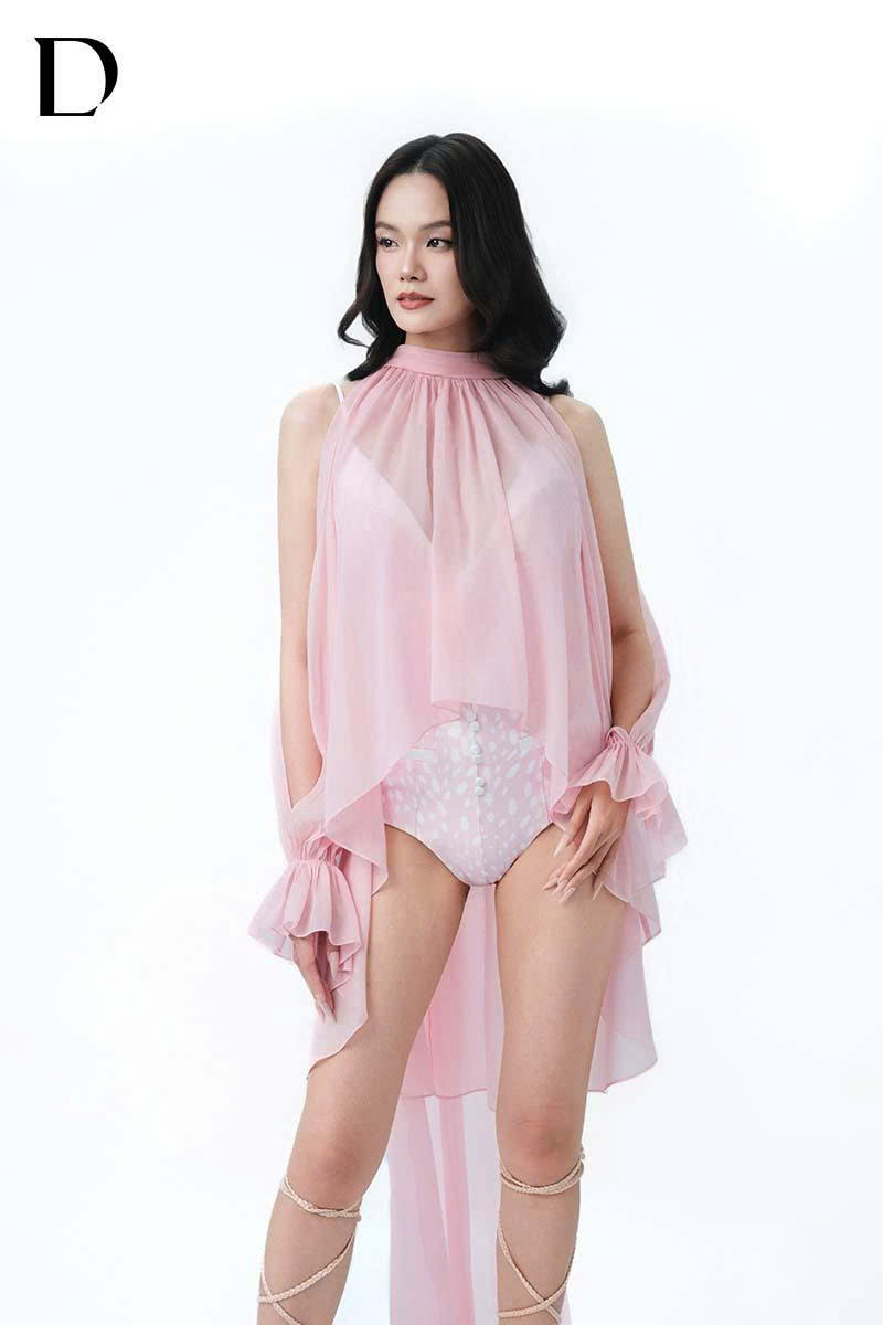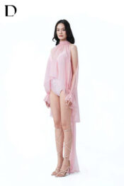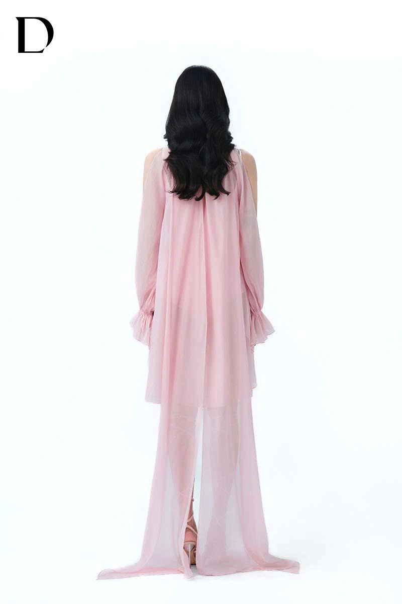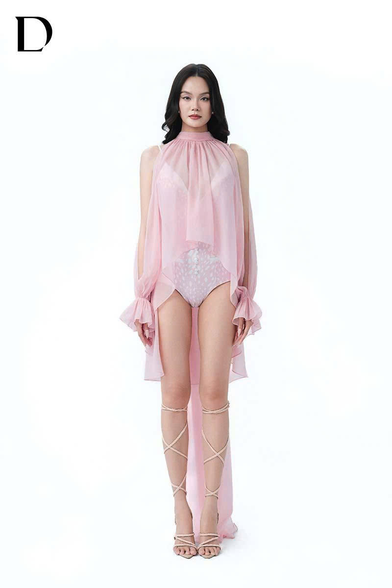 Thiết kế set trên nền taffeta và chiffon, gam màu pastel pink. Bodysuit hai dây ôm sát, kết hợp áo tơ phủ ngoài xẻ tay, kéo dài tà sau lưng.