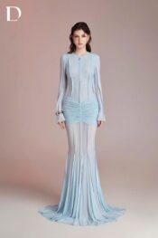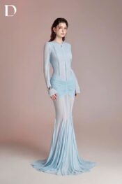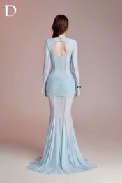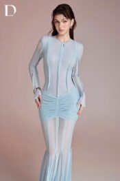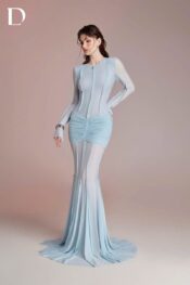 Long dress gam Light Blue. Phom váy ôm được phát triển trên chất liệu spandex dập nhúng. Đường ráp lộ được xử lý trực diện, phần chân váy mở nhẹ tạo độ loe theo chuyển động.