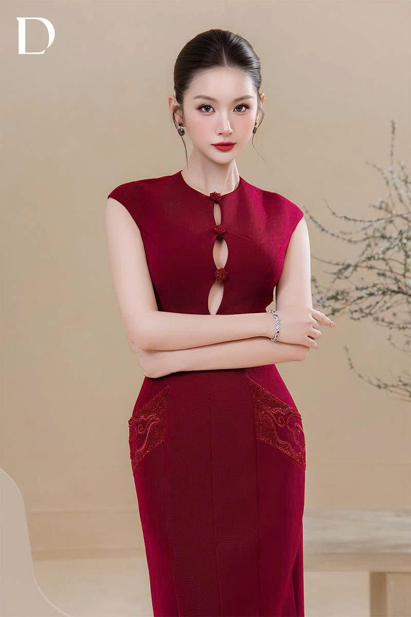 Long dress sắc wine red với phom ôm gọn, xử lý trên nền cotton đỏ đô mềm, định hình form dáng rõ ràng và cân đối.