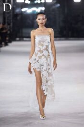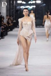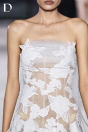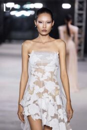 Thiết kế màu trắng kết hợp ren, lưới và đăng lưới, tạo bề mặt đa lớp. Phom váy xéo bất đối xứng trên nền lưới, thân váy đính ren hoa thủ công. Chi tiết đăng lưới đính pha lê ở ngực và tà lưới phía sau tạo hiệu ứng ánh sáng.