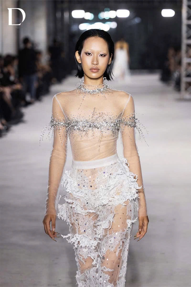 Thiết kế kết hợp ren và lưới. Áo bodysuit xuyên thấu đính đá ở ngực, xử lý sợi cước bấm thủ công. Chân váy bút chì trang trí hoa ren 3D và đá đính, định hình silhouette và chiều sâu.