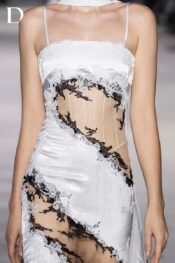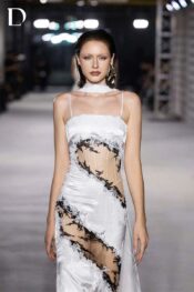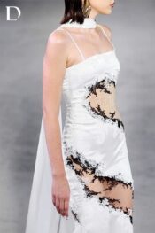 Thiết kế kết hợp lụa nhũ và ren. Phom váy dài cúp ngực đi kèm khăn choàng cổ dài. Chi tiết cut-out ở eo tạo cấu trúc rõ nét. Các mảng ren trắng–đen cắt tỉa thủ công trên thân váy gợi hiệu ứng cháy xém, thể hiện tinh thần EMERGE.