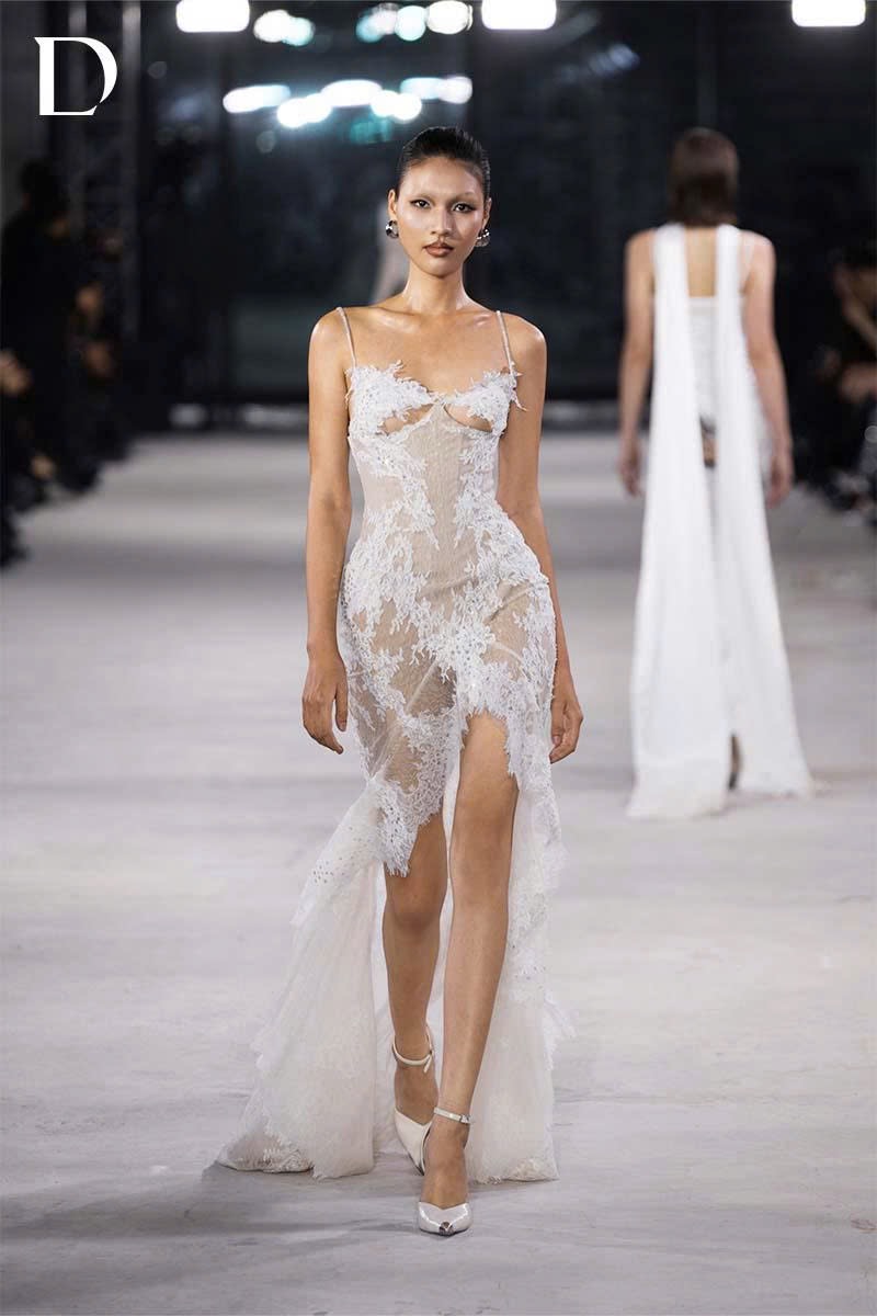 Thiết kế váy ren mullet kết hợp jumpsuit corset siết eo, định hình phom dáng. Các mảng ren đính kết thủ công chạy dọc thân váy. Tùng mullet phía sau tạo chuyển động, hoàn thiện tinh thần EMERGE.