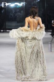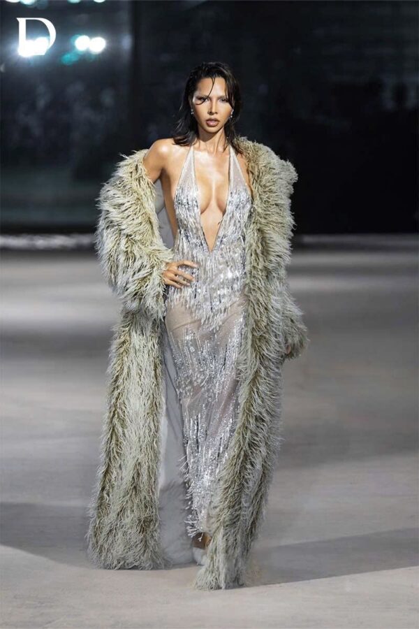 Thiết kế form lưới cổ V khoét sâu mang sắc thái gợi cảm. Đường cắt lưng hở được xử lý tinh gọn, kết hợp đính kết đá và tua rua giúp chuyển động trở nên sống động và giàu chiều sâu. Khi người mẫu sải bước, các chi tiết lưới đính đá bắt sáng liên tục, tạo hiệu ứng thị giác cuốn hút. Hoàn thiện tổng thể là áo choàng lông, tăng cảm giác quyền lực và mạnh mẽ cho diện mạo.