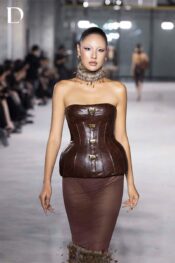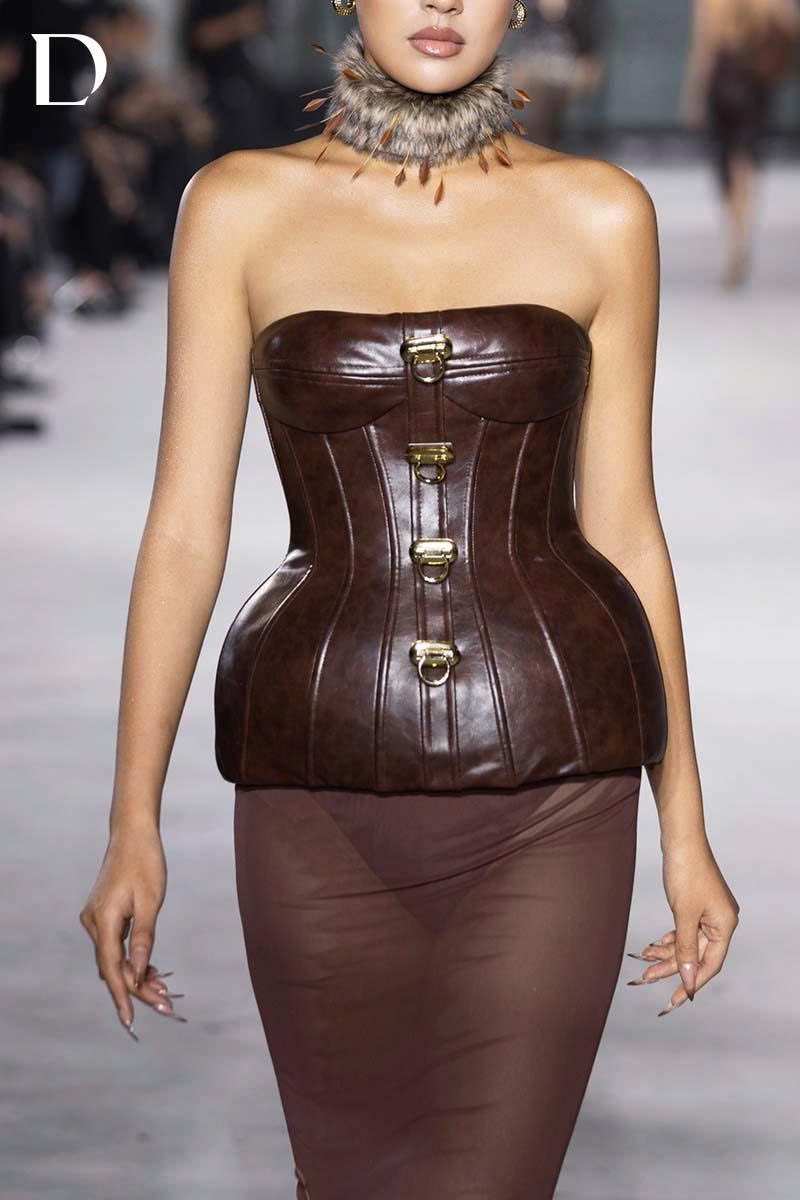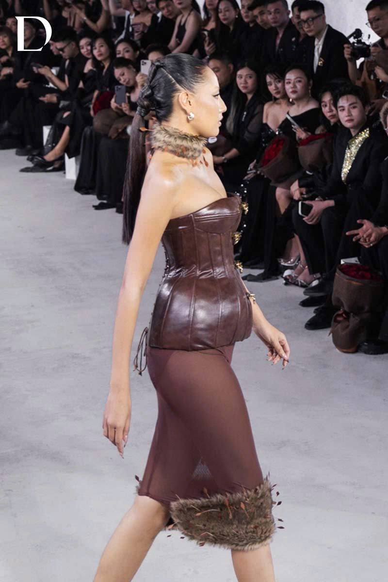 Thiết kế màu dark brown được phát triển trên chất liệu da cotton, lưới thun và lông cotton. Phần corset da siết eo được dựng phồng nhẹ, tạo hiệu ứng vòng eo nổi khối và tôn đường cong một cách dứt khoát. Layer váy xuyên thấu phối lông ở chân váy mang lại chuyển động mềm, đồng thời giữ nét mạnh mẽ đặc trưng.