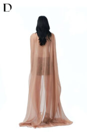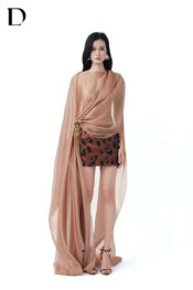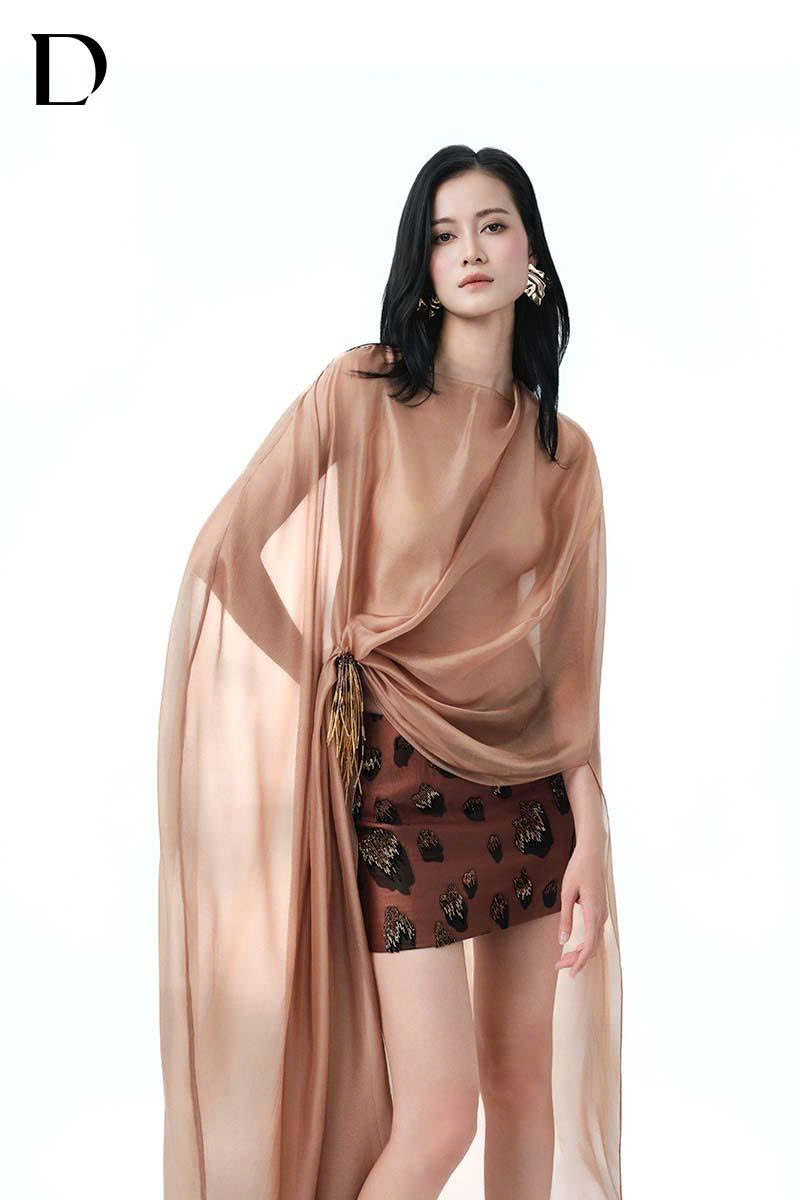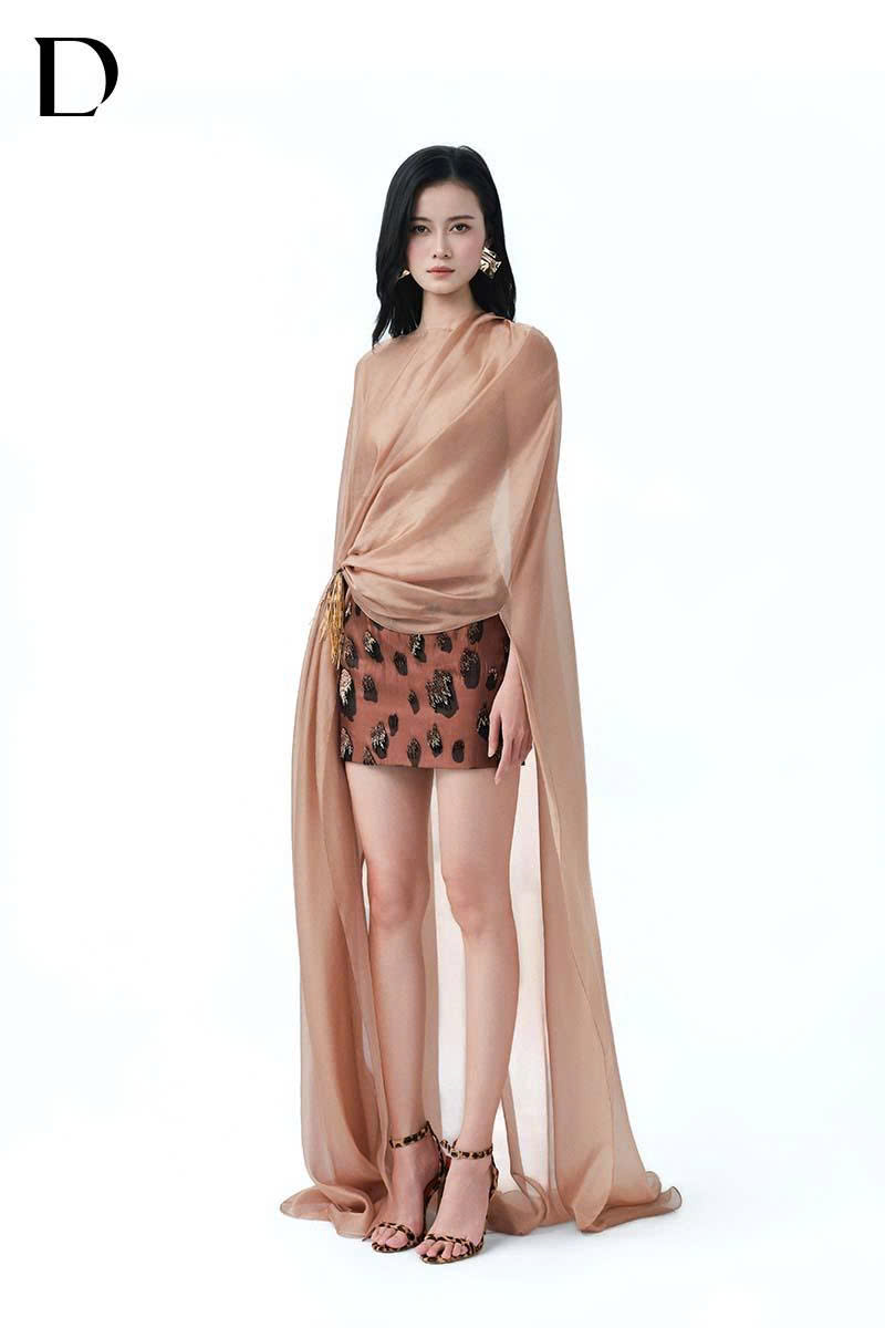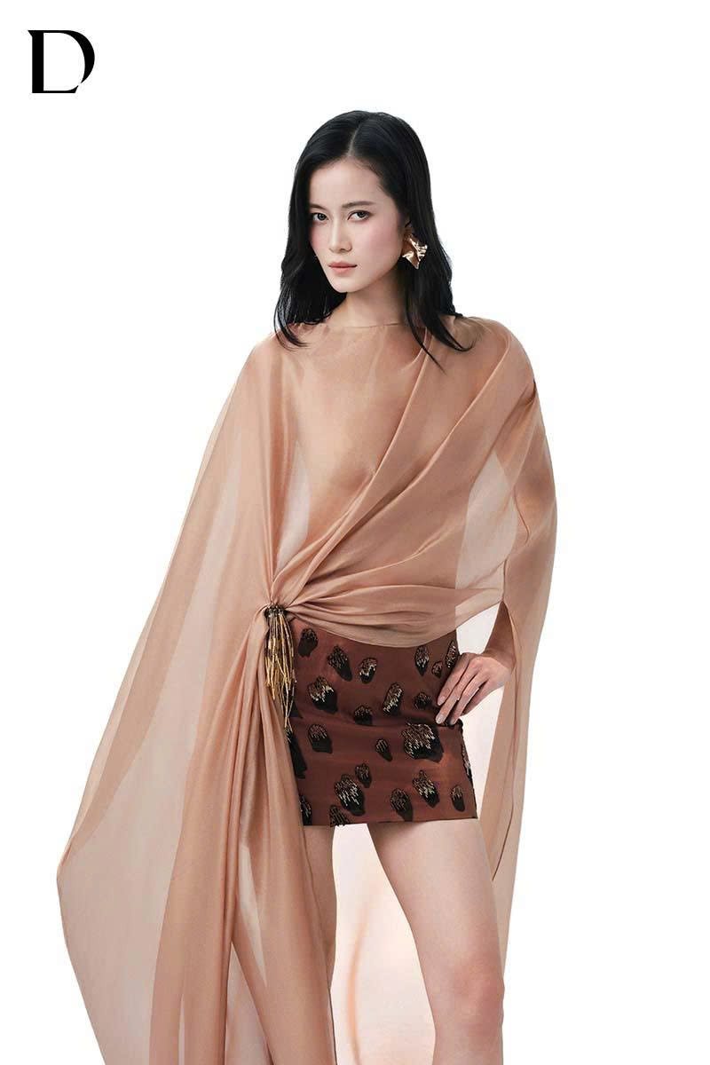 Thiết kế set mini dress trên nền silk và chiffon blend, gam màu brown/nude brown, xử lý draping tại thân áo. Phom váy ôm gọn, phát triển hoạ tiết báo đốm, kết hợp đính kết thủ công.