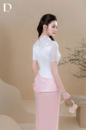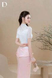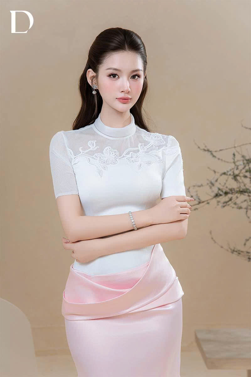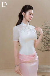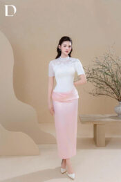 Long dress gam white – baby pink. Phom dáng ôm gọn, xử lý tỷ lệ cơ thể. Thân trên sử dụng lụa vân, kết hợp lụa san thun cho chân váy, tạo chuyển tiếp giữa cấu trúc và độ rũ.