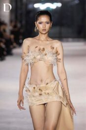 Thiết kế màu beige sử dụng chất liệu tafta, tạo độ đứng phom rõ rệt cho set áo ngực và chân váy. Phần tà váy lệch được xử lý tinh gọn, tạo chuyển động dứt khoát. Toàn bộ thiết kế được trang trí đính kết lông vũ, mang lại hiệu ứng mềm mại, đối lập tinh tế với cấu trúc mạnh mẽ của tafta.