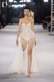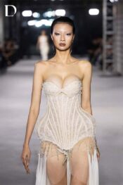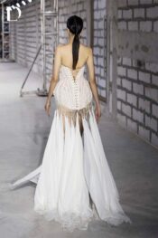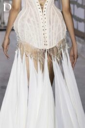 Thiết kế kết hợp ren và voan, khai thác vẻ đẹp mềm mại nhưng vẫn giữ cấu trúc rõ rệt. Phần áo corset được dựng 3D ở hông, tạo silhouette nổi khối sắc nét và hiện đại. Trên bề mặt, các mảng đính kết đá pha lê được xử lý tinh xảo, kết hợp cùng những lớp vải treo nhiều tầng, mang lại hiệu ứng chuyển động đầy lôi cuốn.