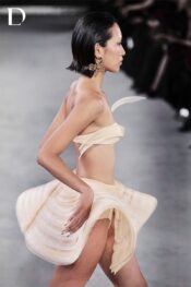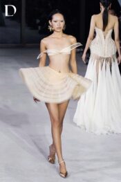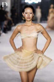 Thiết kế mang phom dáng sắc lạnh và cấu trúc mạnh mẽ, được dựng trên nền tafta và lưới cứng để tạo độ đứng phom đặc trưng. Set áo ngực kết hợp chân váy xòe bất đối xứng mang lại hiệu ứng thị giác dứt khoát và hiện đại. Mặt dưới chân váy được đính pha lê, tạo ánh phản quang tinh tế khi chuyển động, giúp tổng thể nổi bật trên runway.