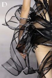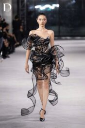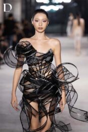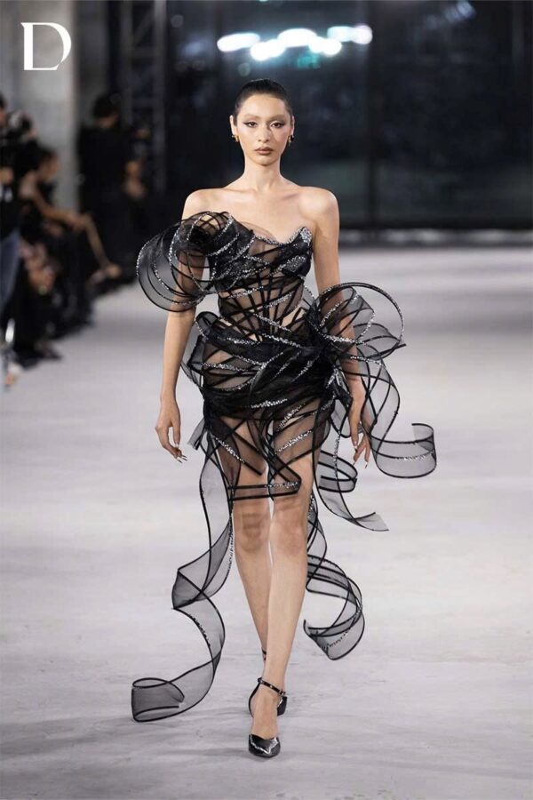 Thiết kế sử dụng đăng lưới xoắn tạo khối 3D, mang đến hiệu ứng chuyển động mềm mại nhưng giàu cá tính. Bên trong là corset dựng form, giúp giữ phom sắc nét và tôn đường cong cơ thể. Bề mặt được đính kết đá ánh bạc, tạo điểm nhấn lấp lánh dưới ánh đèn, thể hiện tinh thần EMERGE hiện đại và cuốn hút.