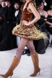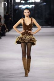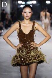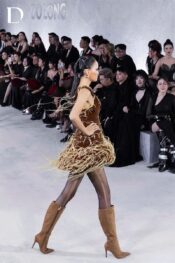 Thiết kế màu brunette brown mang sắc thái trầm hiện đại. Trang phục kết hợp chất liệu nhung và lông vũ, tạo bề mặt đối lập giữa mềm mại và mạnh mẽ. Chiếc váy ngắn được dựng form sắc gọn, điểm xuyết khóa kim loại và chi tiết lông vũ, mang đến tổng thể cá tính.