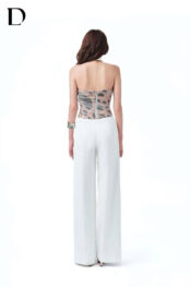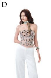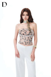 Thiết kế set trên nền lưới và vải vân nổi, gam màu white / beige brown. Cúp ngực corset in hoạ tiết động vật, xử lý draping lưới xếp nếp tạo chiều sâu bề mặt.