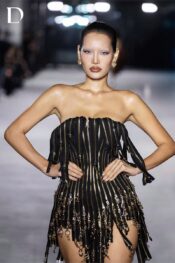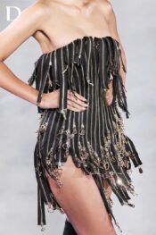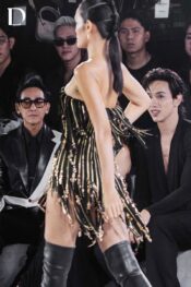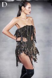 Thiết kế màu black – gold mang sắc thái mạnh mẽ và cá tính rõ nét. Trang phục sử dụng dây kéo đính trên nền lưới, tạo nên bề mặt cấu trúc độc đáo và có chiều sâu. Các mặt dây kéo được xử lý thành tua rua rủ theo chuyển động, mang lại hiệu ứng thị giác sắc sảo và hiện đại.