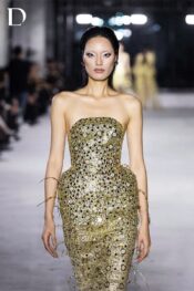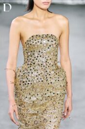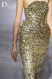 Thiết kế sử dụng lưới kim tuyến, tạo hiệu ứng ánh sáng chuyển động đầy cuốn hút. Phom đầm cơ bản được xử lý độn hông nhẹ, giúp silhouette trở nên sắc nét và gợi cảm theo tinh thần high fashion. Toàn bộ bề mặt được đính kết kết hợp khoen tròn, đá trang trí, lớp tráng gương và sợi cước bấm kim sa, hình thành cấu trúc lấp lánh nhiều tầng với chiều sâu thị giác rõ nét.
