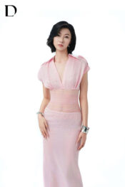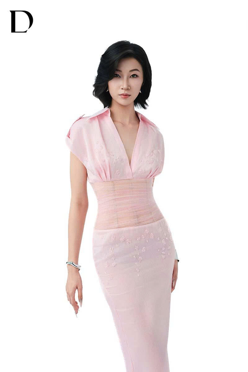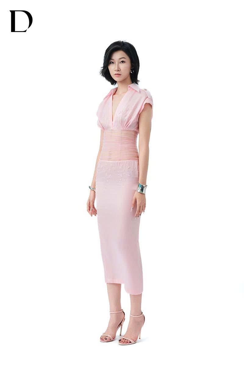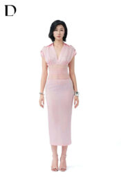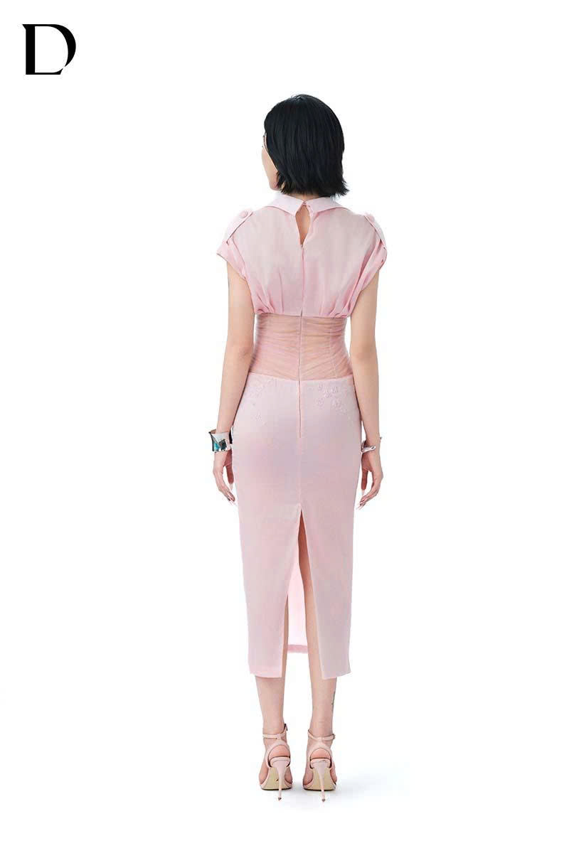 Thiết kế midi dress trên nền crepe và lưới mềm, gam màu hồng pastel. Phom ôm body, cổ V, tay ngắn ôm, xử lý draping thân trước, chi tiết xếp lưới chuyển màu tại eo.