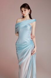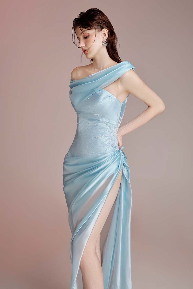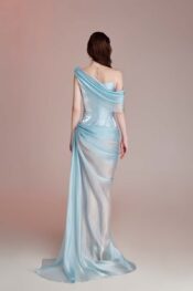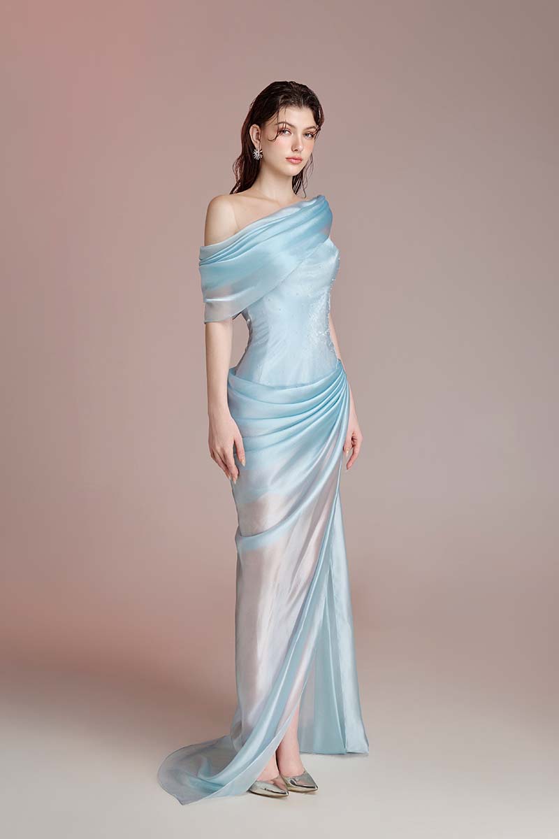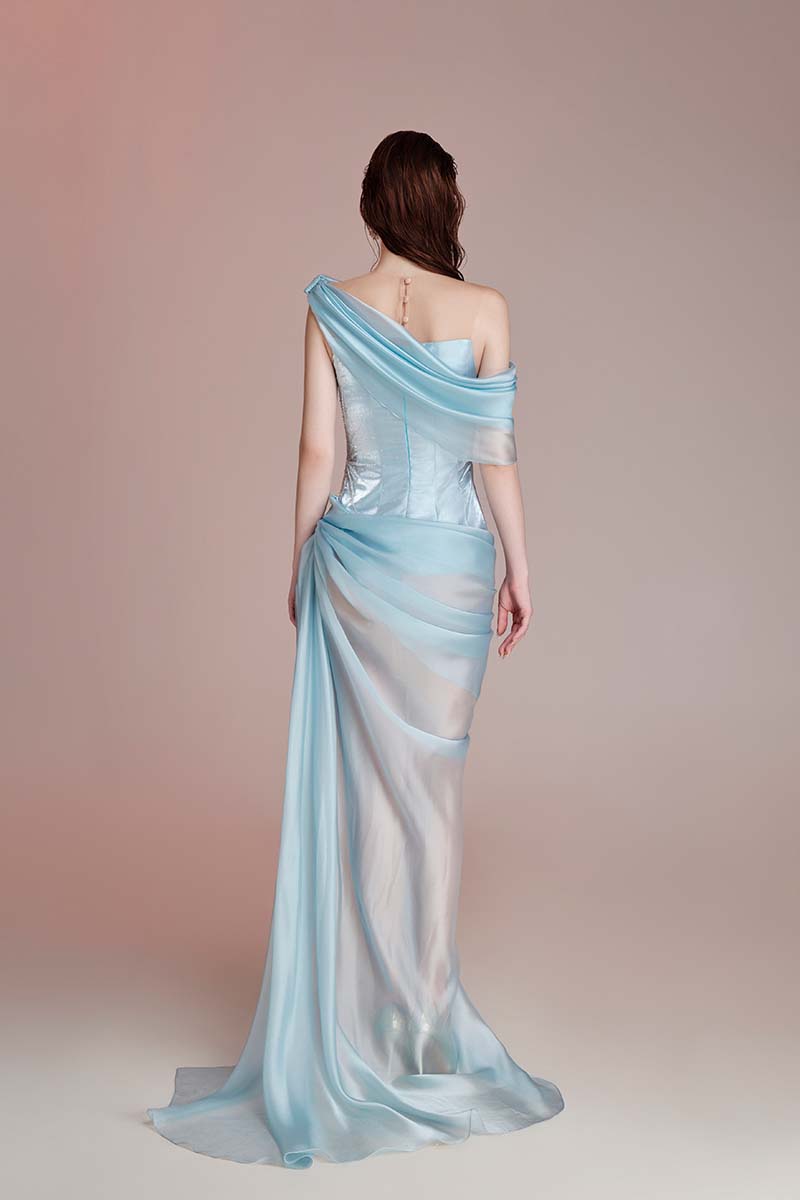 Thiết kế gam Light Blue. Chất liệu tafta và voile được xử lý draping theo chuyển động cơ thể, kết hợp đính kết pha lê.