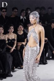 Thiết kế dạ hội với phom ôm cổ halter, tôn dáng sắc gọn. Các mảng cutout được xử lý tinh tế, tạo hiệu ứng gợi cảm vừa đủ. Chi tiết khoen kim loại kết hợp đá trên thân váy mang đến kết cấu hiện đại, giúp tổng thể nổi bật dưới ánh sáng sân khấu.