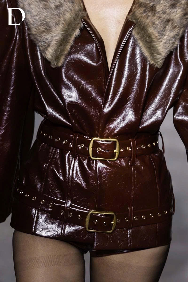 Thiết kế burgundy brown mang chiều sâu mạnh mẽ. Trang phục sử dụng da cotton kết hợp lông cotton, tạo nên bề mặt đa chất liệu hiện đại. Set áo khoác đi cùng quần ngắn da bóng mang lại phom dáng sắc gọn và cá tính, trong khi phần cổ lông bản lớn tăng cường cấu trúc thị giác.