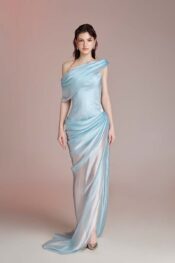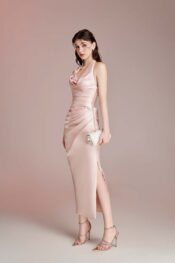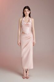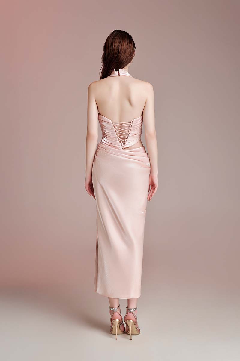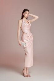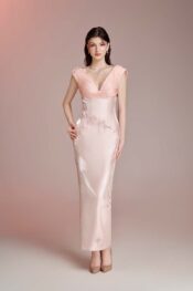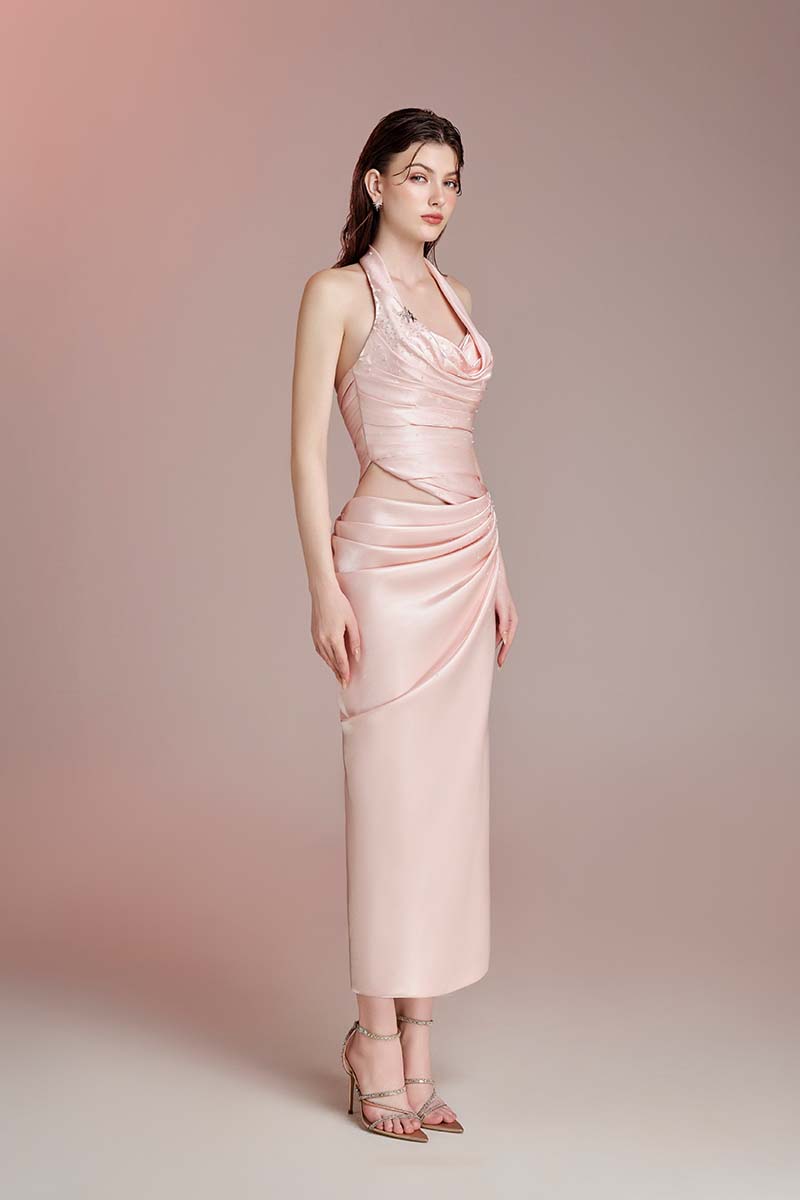 Thiết kế tông pink pastel trên nền tafta. Draping theo dáng cơ thể. Đính kết pha lê và charm ngôi sao.