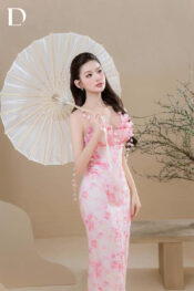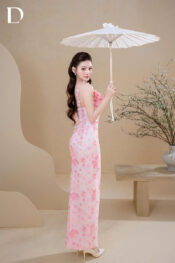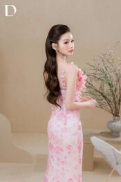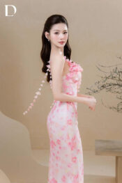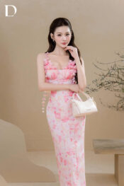 Long dress gam pastel pink. Phom dáng ôm gọn. Chất liệu voan in họa tiết hoa peony watercolor, xử lý chuyển động theo bước đi.
