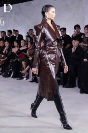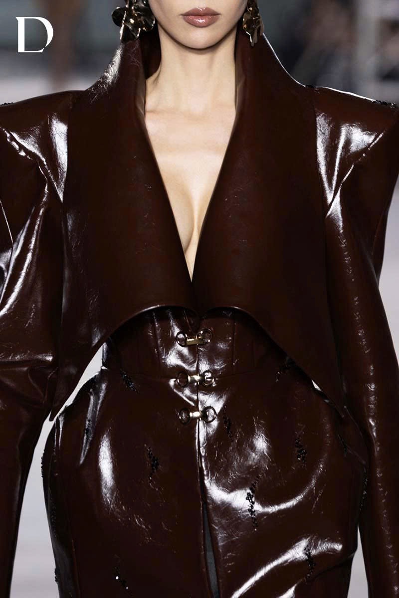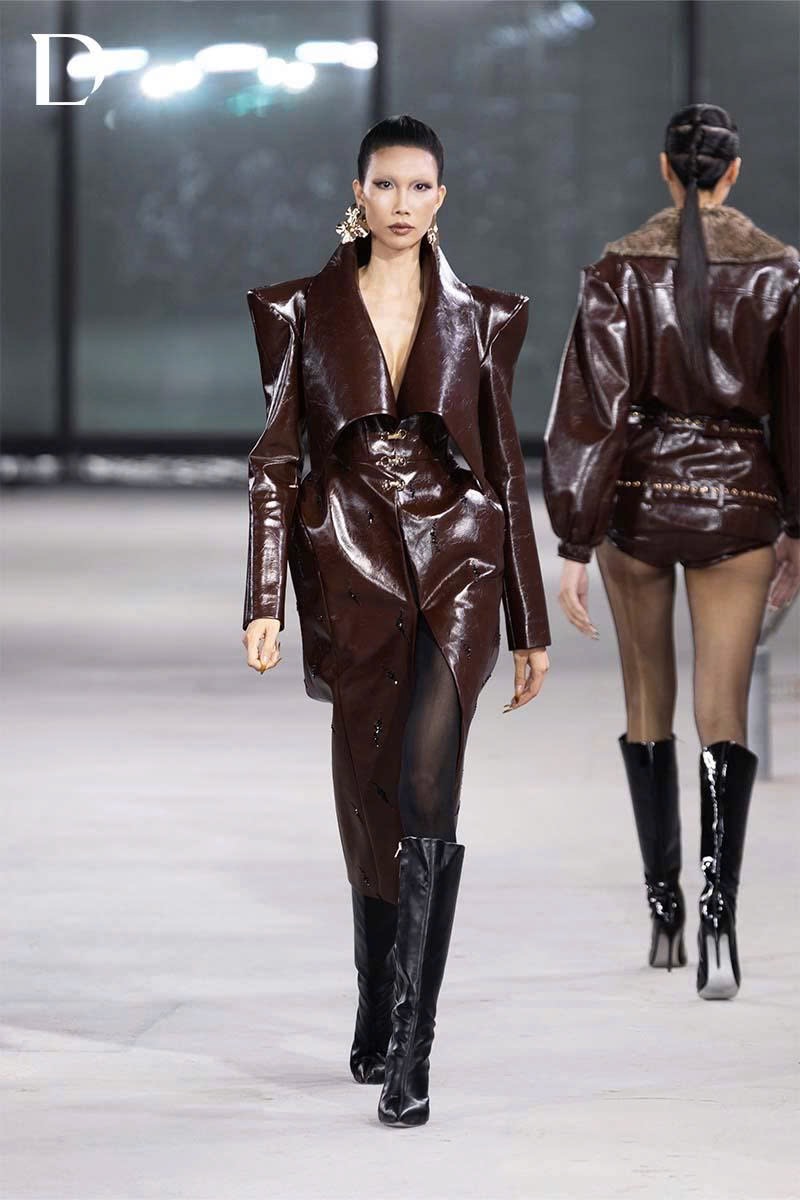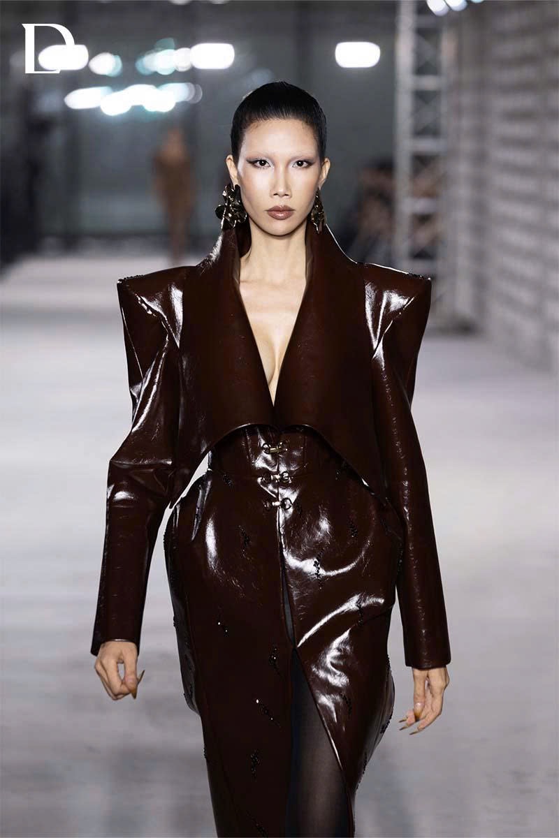 Thiết kế sử dụng cầu vai nhọn trên nền chất liệu da, kết hợp lá cổ bản to tạo cấu trúc nổi bật, mang lại diện mạo dứt khoát và giàu khí chất. Phần sau được trang trí bằng ren cùng chi tiết mang dấu ấn thương hiệu đặc trưng của Do Long, tạo điểm nhấn tinh tế khi người mẫu xoay người trên runway.