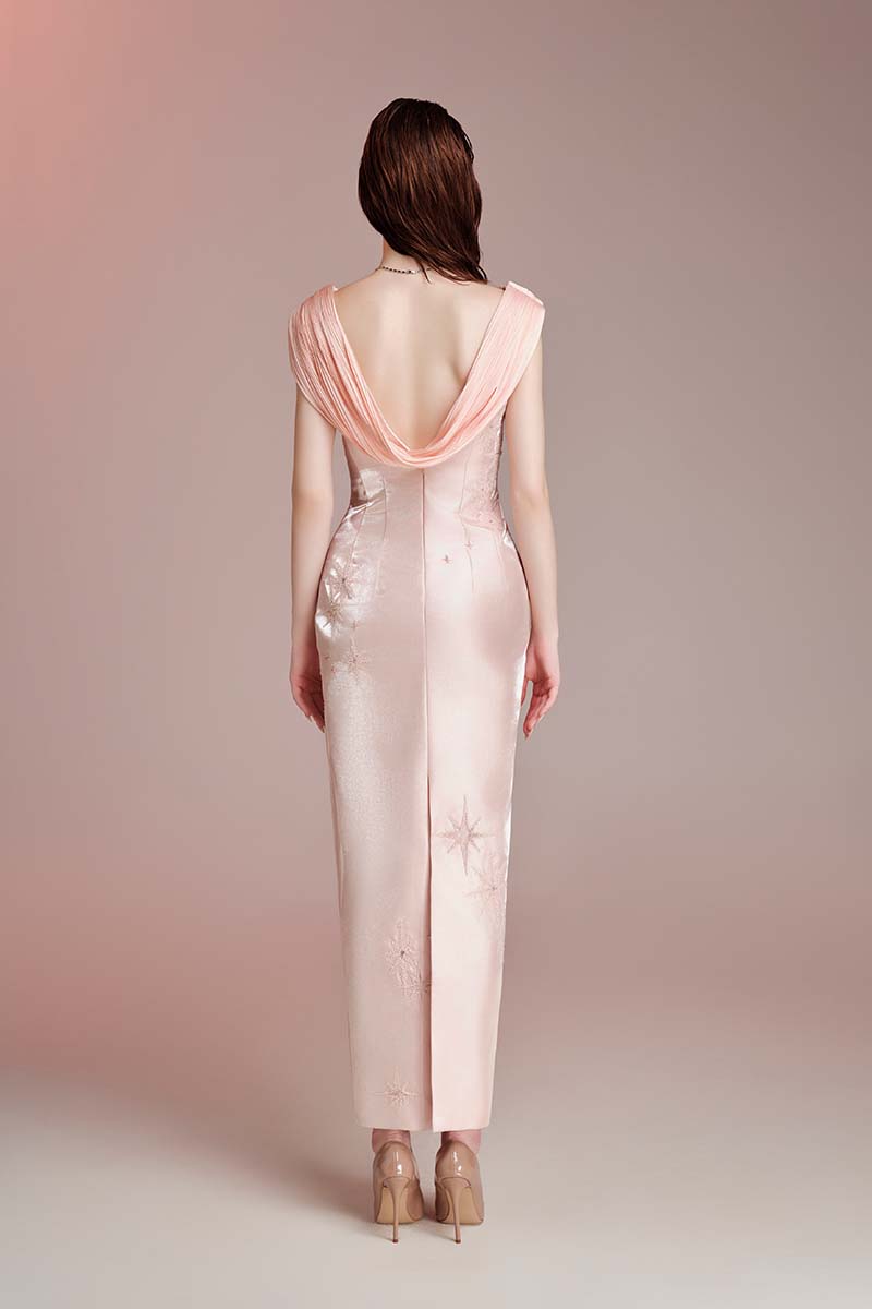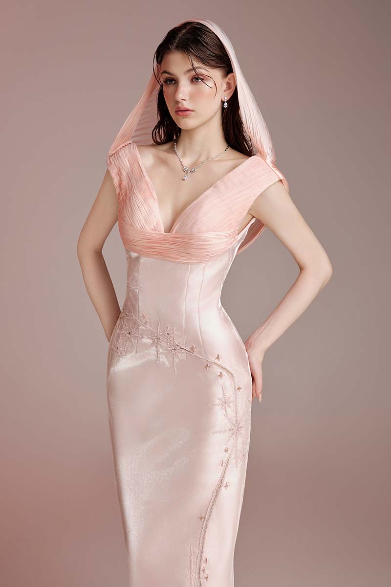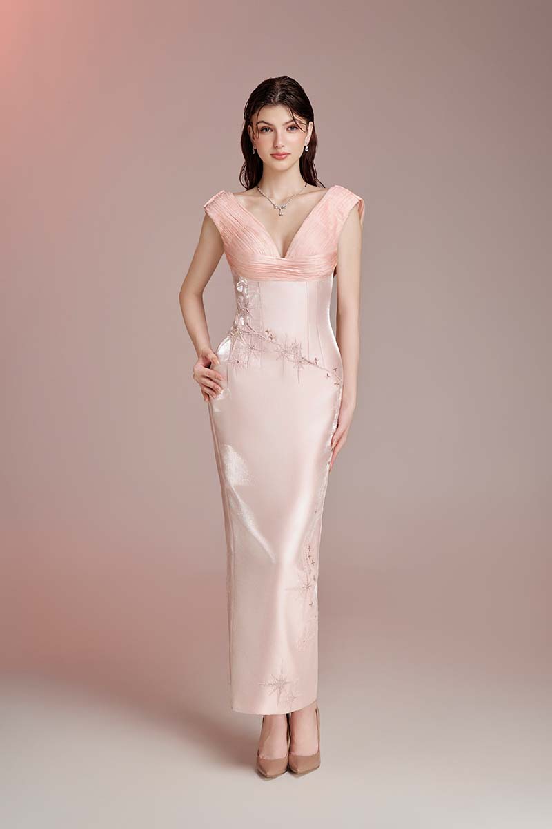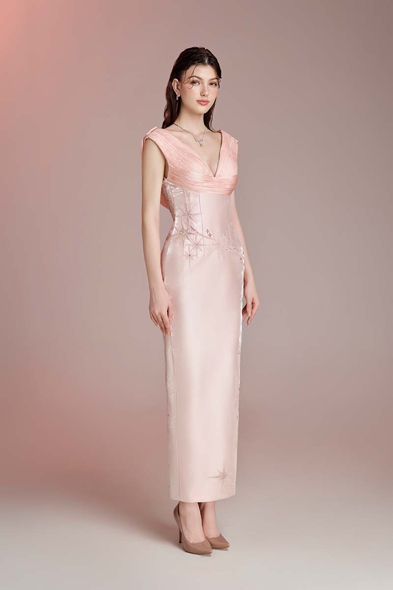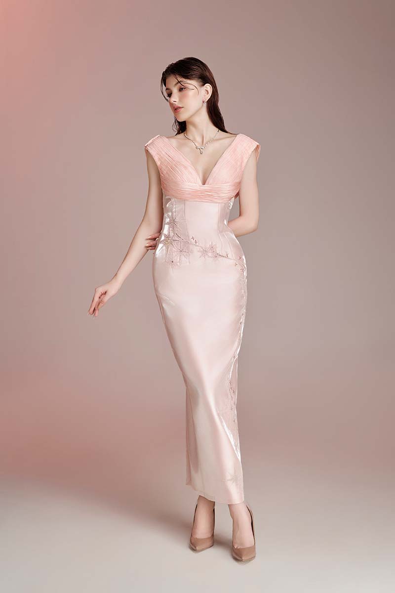 Thiết kế tông pink pastel trên nền tafta và voile. Phần cúp áo dập ly thủ công theo dáng cơ thể. Thân sau với tà dập ly đổ lưng. Thêu đục lỗ kết hợp đính kết pha lê.