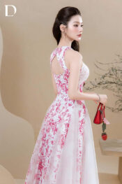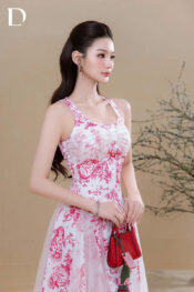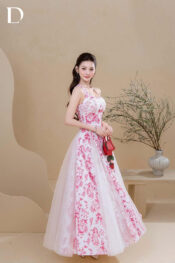 Midi dress gam hồng – trắng. Chất liệu lụa vân kết hợp lưới nilen. Họa tiết hoa lan, thỏ và chim được in chuyển nhiệt trên bề mặt thiết kế.