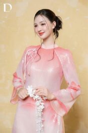 Gam màu Mary’s Rose và Pink Lemonade được xử lý trên nền kim sa in kết hợp lụa ánh kim, tạo hiệu ứng ánh sáng và chiều sâu bề mặt. Họa tiết núi non xử lý cách điệu, trải dọc thân áo, định hình bố cục và nhịp điệu thị giác. Thiết kế tái hiện cảm hứng thiên nhiên Việt Nam thông qua ngôn ngữ màu sắc và chất liệu mang tinh thần mùa xuân.